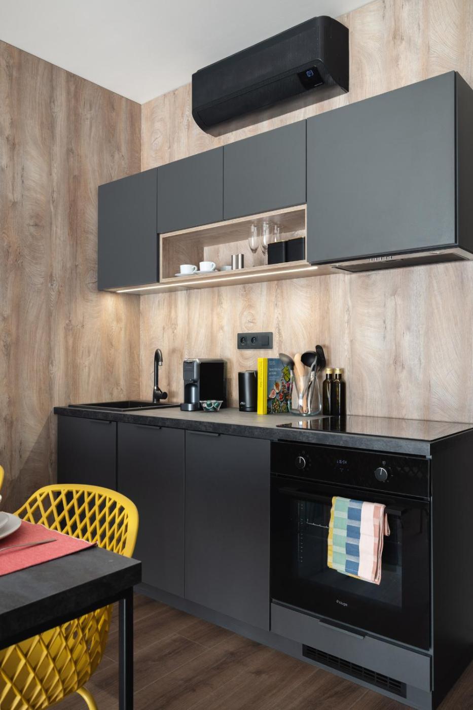 Studio with Balcony. The studio has a private bathroom, air conditioning, a washing machine, as well as a seating area with a flat-screen TV. The well-fitted kitchen features a stovetop, a refrigerator, a dishwasher and kitchenware. Boasting a balcony, this studio also features a tea and coffee maker, a wardrobe and a TV. The unit has 2 beds. ;