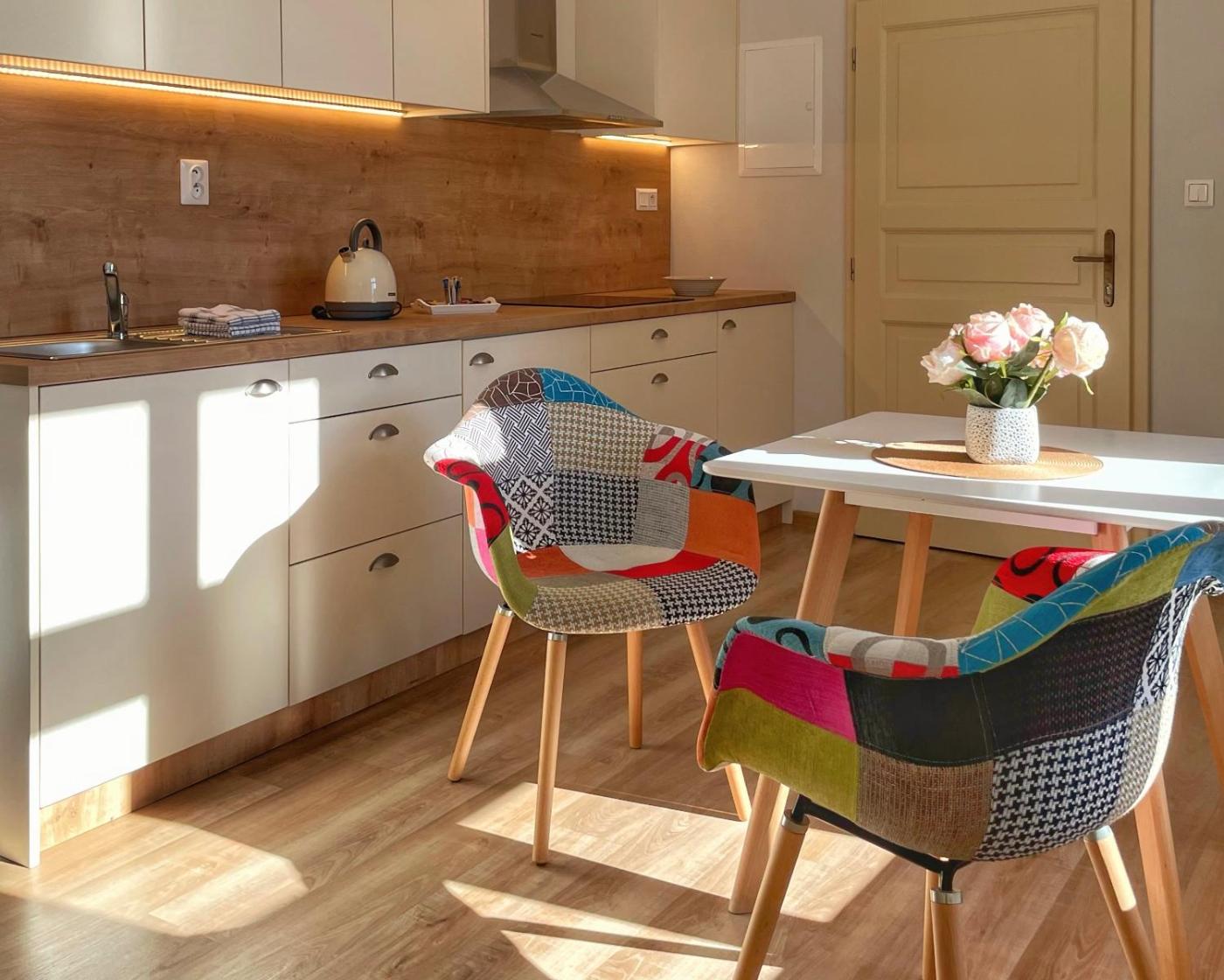 Executive Two-Bedroom Apartment. Attic apartment with large living room, kitchen, eating corner, 2 bedrooms, 2 cloak-rooms, 1 toilet and luxury bathroom also with toilet. From each attic window there are views over Sušice town and its surroundings. Each apartment is equipped with plasma TV, WiFI, a refrigerator, a microwave, dishwasher and ceramic hob. ;